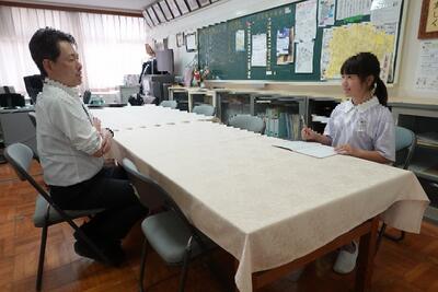 南小学校の授業やノーチャイムのことをインタビューにきてくれました。「早速ですが」は、定型のようでした。