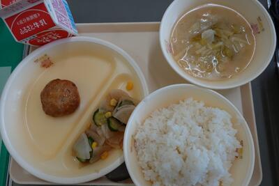 白給食の日。全体的に白っぽい。「つくね」が餃子だったら完ぺきだったね、と5年生ともお話ししていました。