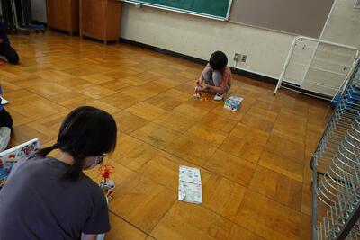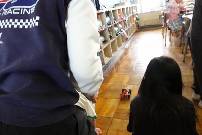 遊びながら、どうしてまっすぐ走らなかったり、途中で止まったりするのかを考えて、理科的な思考を働かせていました。