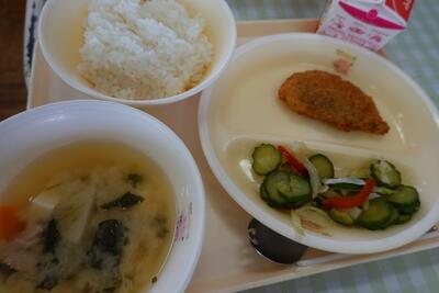 6月最初の給食です。彩の国味噌汁。埼玉県でよくとれる野菜などが入っているのでしょう。きっと。