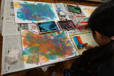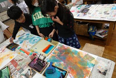 5年生の図工「コロコロローラーダンス」では、ローラーの使い方や色の重なりを工夫して様々な表現をしていました。