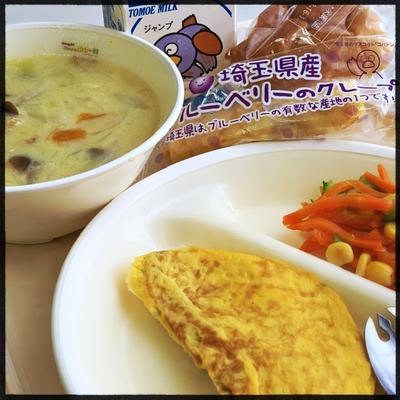 はちみつパン ポパイオムレツ キャロットサラダ(イタリアンドレッシング) 豆乳スープ ブルーベリークレープ 牛乳