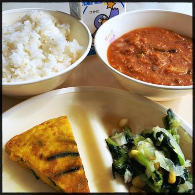 麦ご飯 野菜たっぷりキーマカレー パンプキンアンサンブルエッグ 小松菜サラダ(しそ風味ドレッシング) 牛乳