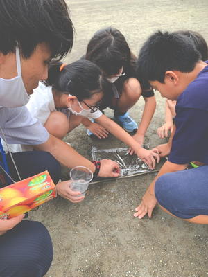 雨があがったので、水がどのように地面を流れるのか実験しました。