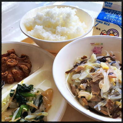 ごはん タコさんたこ焼き 青菜ともやしのナムル(ナムルドレッシング) 白菜の中華風うま煮 牛乳
