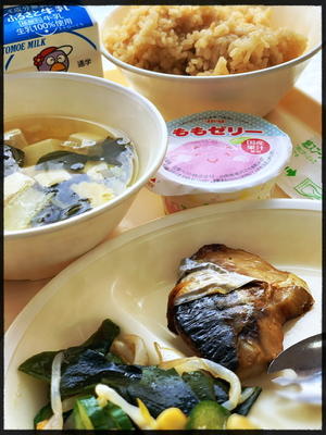 茶飯 サバからみ焼き 五色和え(和風ドレッシング) すまし汁 牛乳 モモゼリー