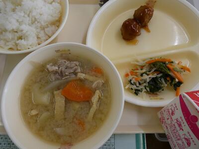「いもさんきょうだいのとんじる」です。何のいもが入っているか分かりましたか?
