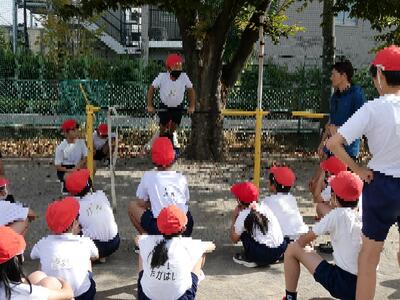5年生は、後方支持回転に挑戦。さまざまな補助具を使って、習得に向けてがんばっていました。