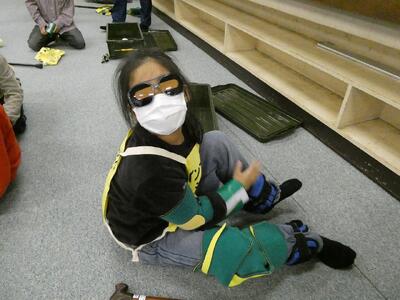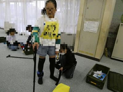 さまざまなグッズをつけて歩き、どのような動きで不自由を感じるのか疑似体験します。