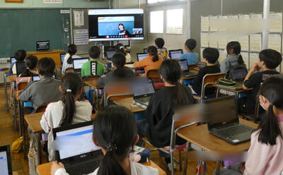 5年生では、担任の先生が出張で不在の中、総合的な学習の時間を隣の教室からライブ中継で行っていました。