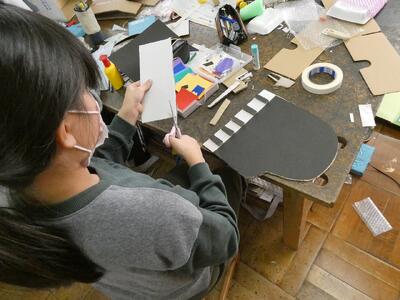 それぞれの教室や場所の特徴からイメージを広げ、材料を工夫して看板づくりに取り組んでいます。