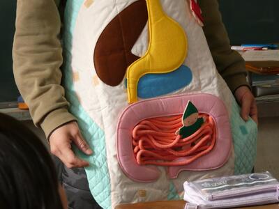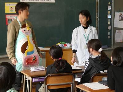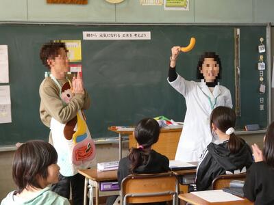 給食センターより外部指導者を招いて、5年生で栄養指導を行いました。今日は、「朝ごはん」についてです。